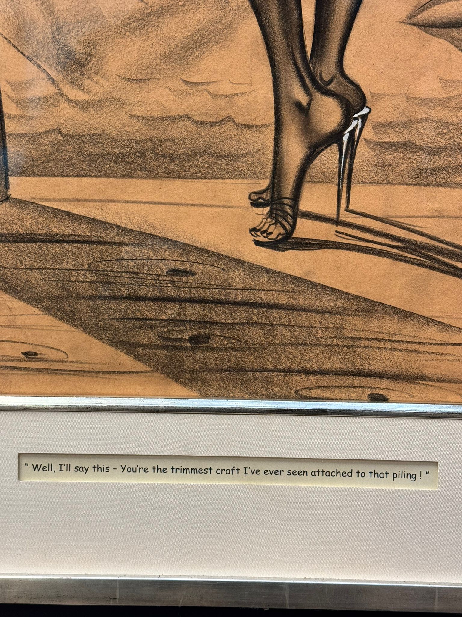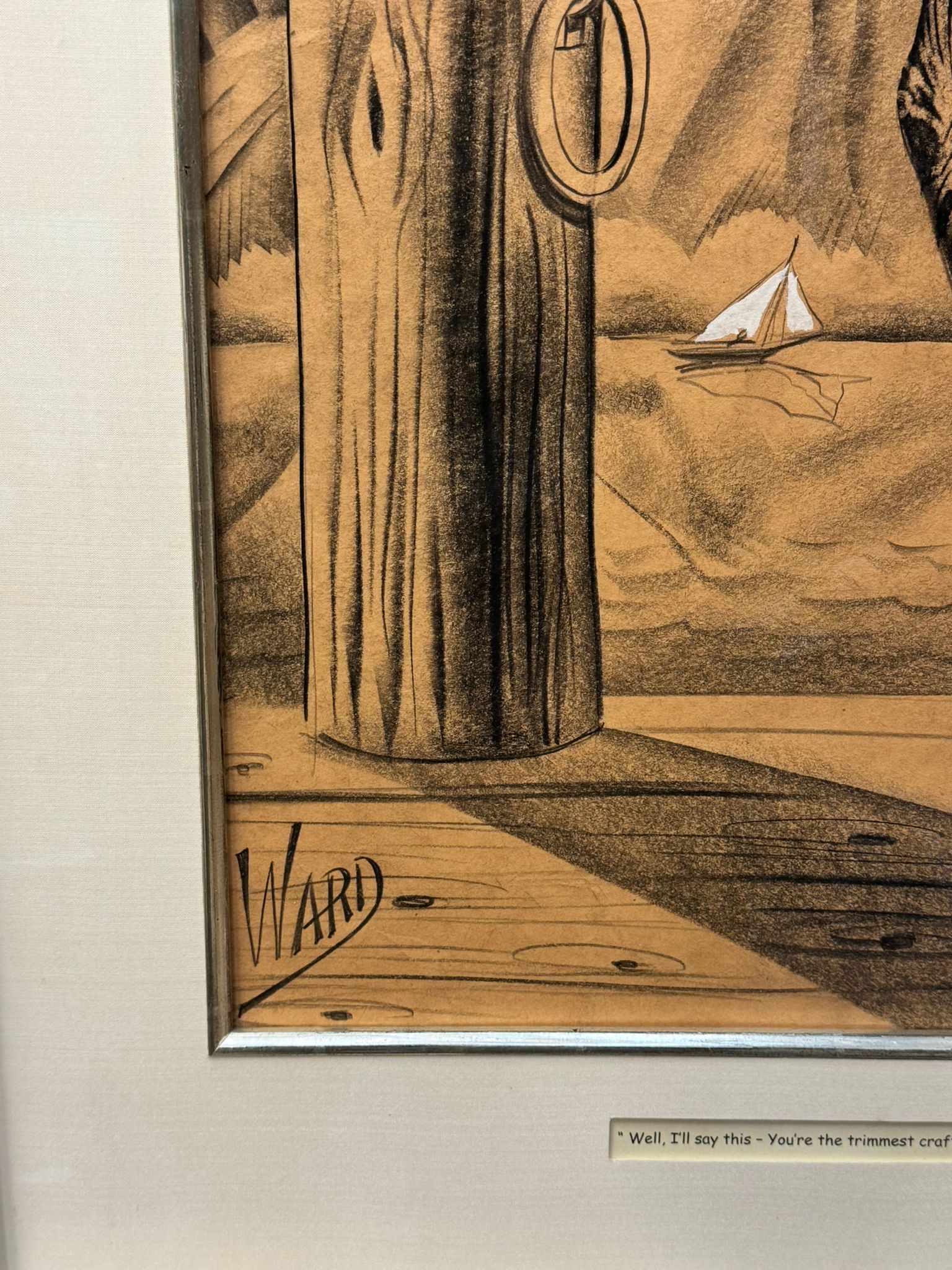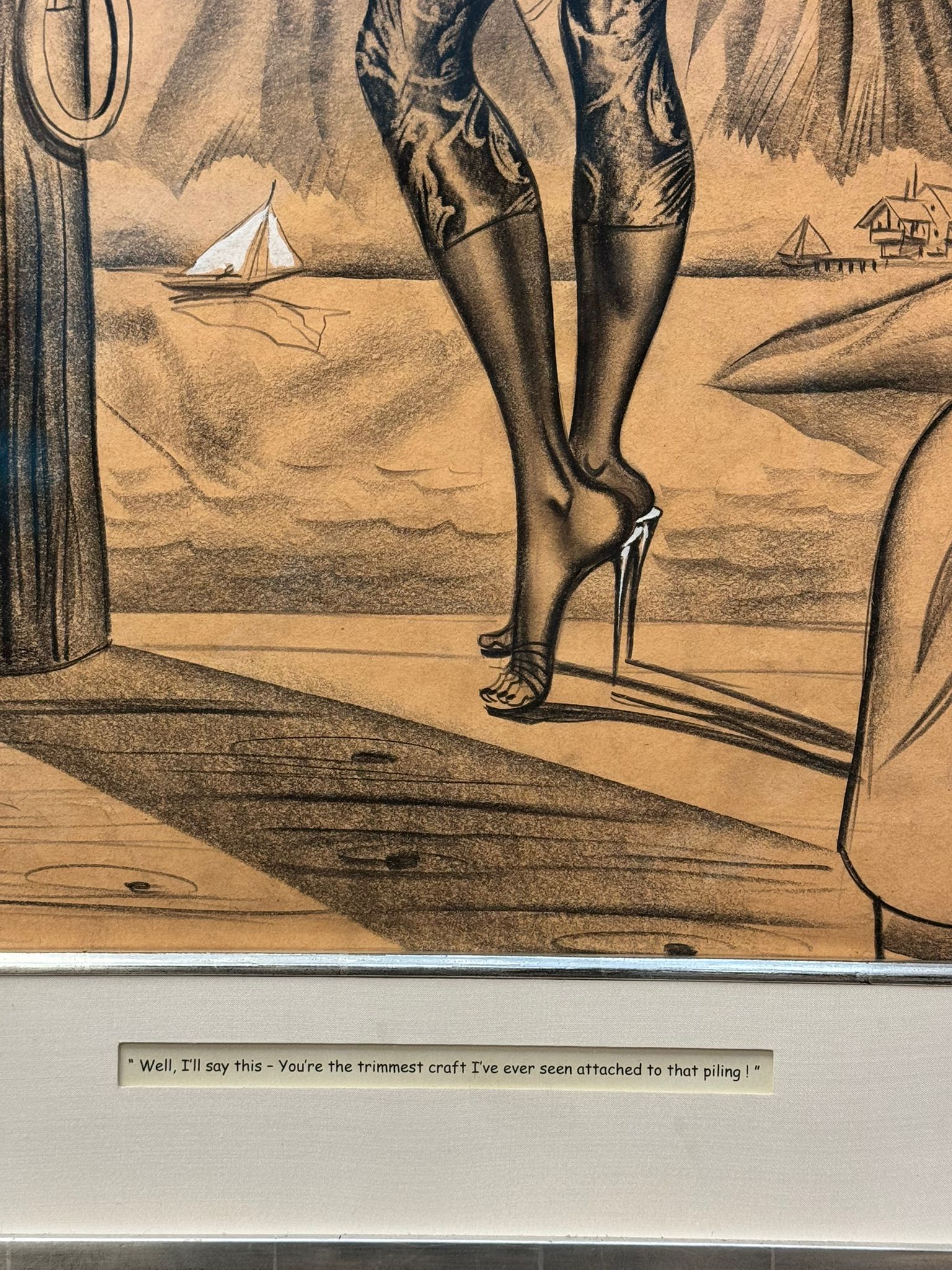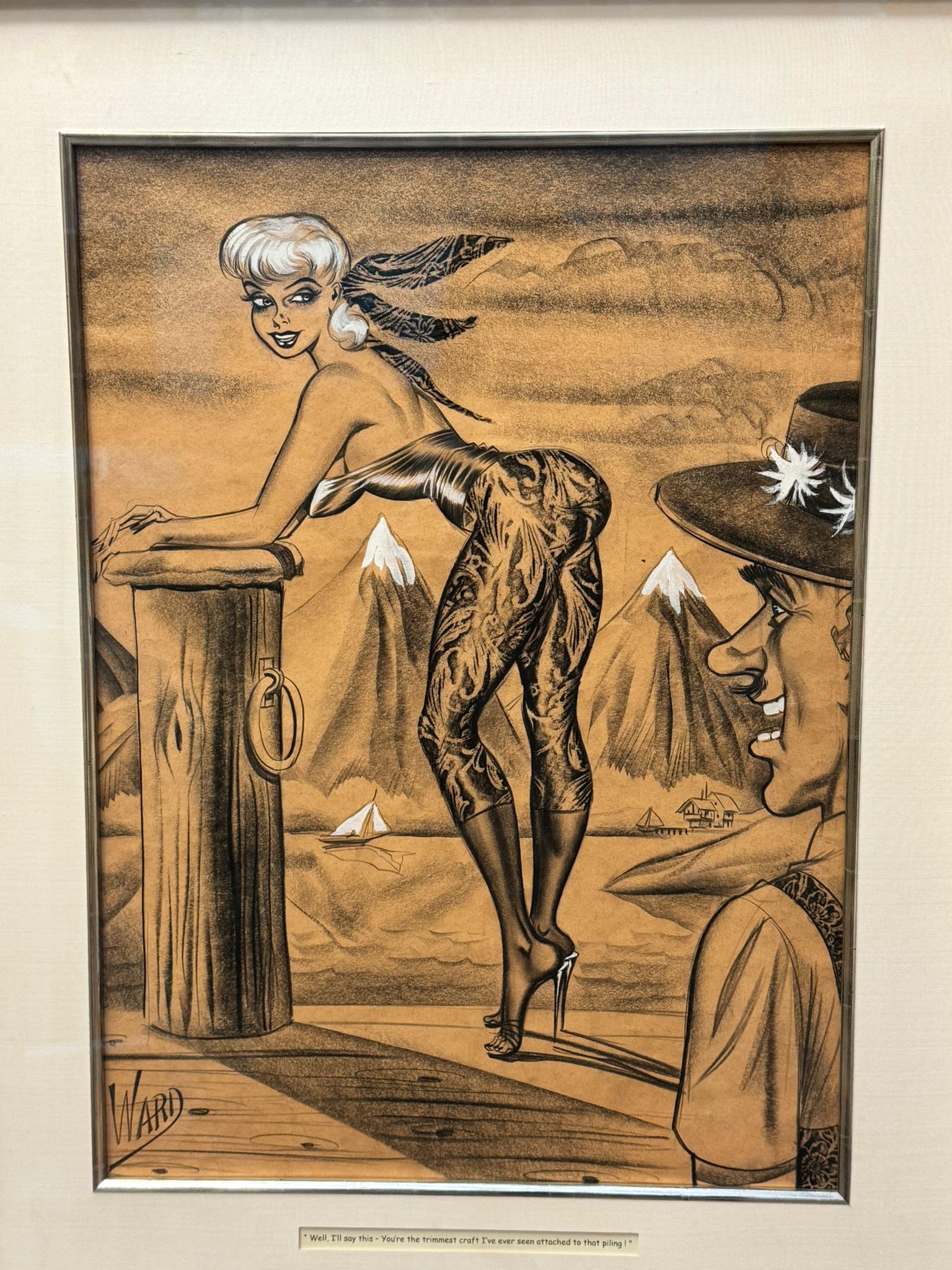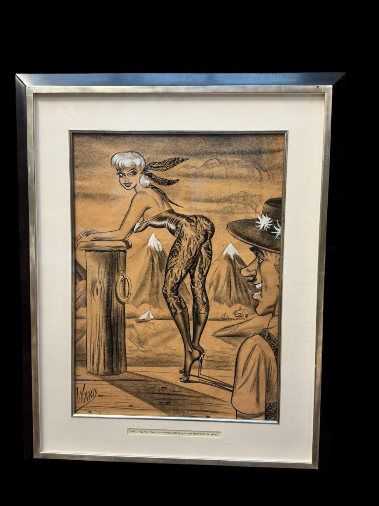 An original and incredibly sought after cartoon by the well listed American artist, William Hess Ward, usually known as Bill Ward 1919-1998. Titled "Let's read lips, darling". Signed to middle right and presented in a decent Gilders Framing museum quality frame, glazed. With provenance to verso.